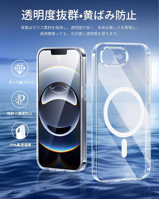 NIMASO iPhone 16e 用 ケース MagSafe対応 クリア 背面 強化ガラス 9H硬度 米軍MIL規格 SGS認証 傷つけ防止 耐衝撃 透明 薄型 バンパー 黄変防止 マグネット搭載 マグセーフ対応 保護カバー ワイヤレス充電対応 ストラップホール付き アイフォン16e対応(6.1インチ)スマホケース(氷晶シリーズ)NSC24L1560 | KAZESHOP