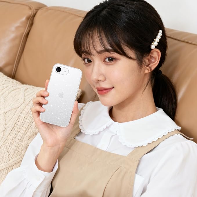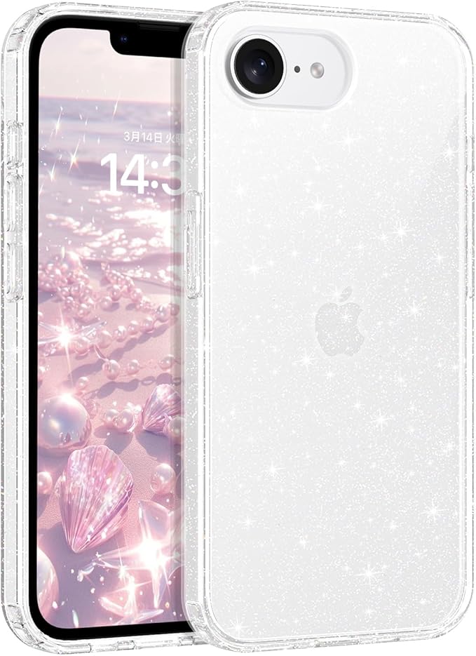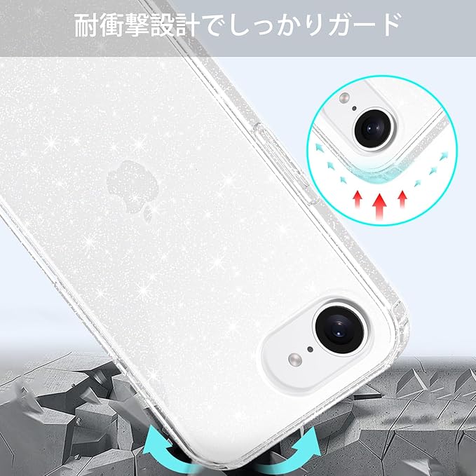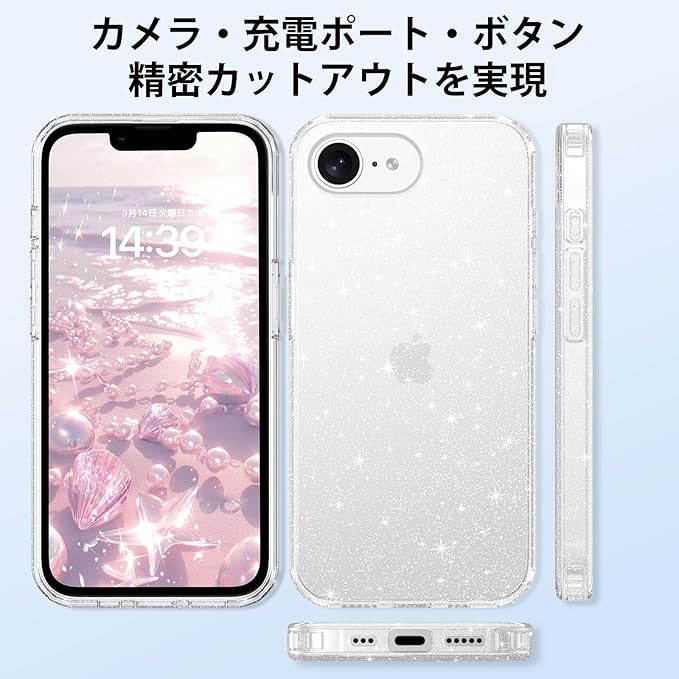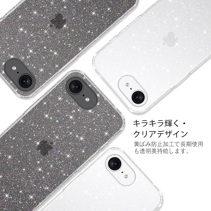 【キラキラ輝く・軽量薄型】透明TPU+PCにキラキラ粒子を練り込み、iPhone 16e の本体色を引き立てつつ、上品な華やかさをプラス。光で変わる輝きが、日常を特別にかわいくします。薄型軽量でポケットにもすっきり。側面の滑り止め加工で持ちやすく、黄ばみ防止でずっと透明な美しさを持続。