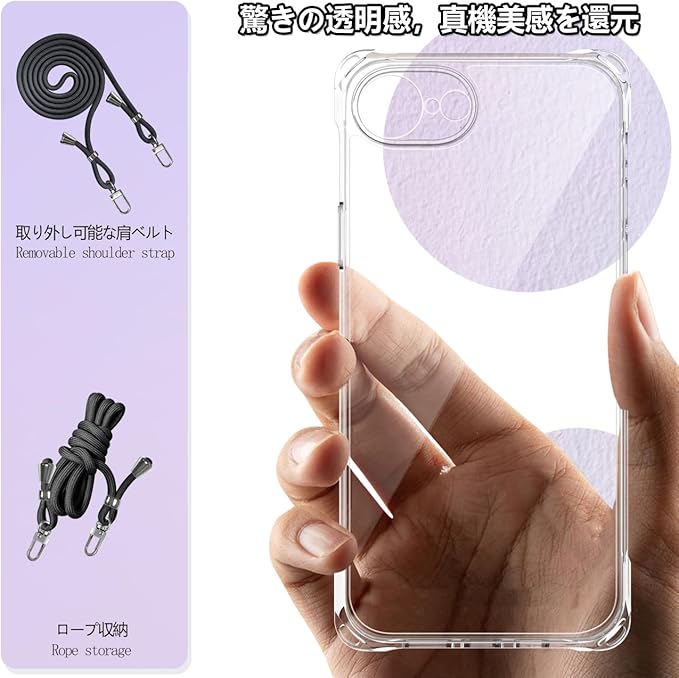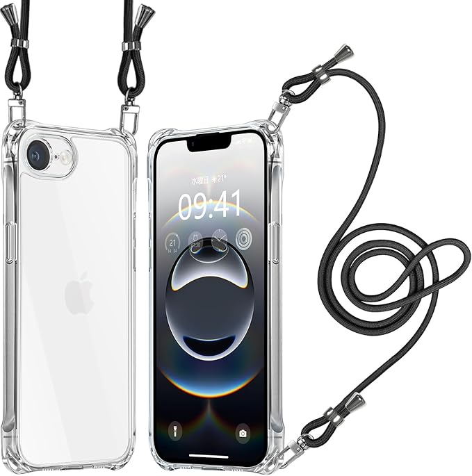 iPhone 16e ケース クリア ショルダー 耐衝撃 肩掛け あいふおん16eケース 首かけ 斜めがけ 縄掛け アイフォン16e カバー 調節可能な 透明 落下防止 縦/横 紛失防止 2WAY (ブラック) | KAZESHOP