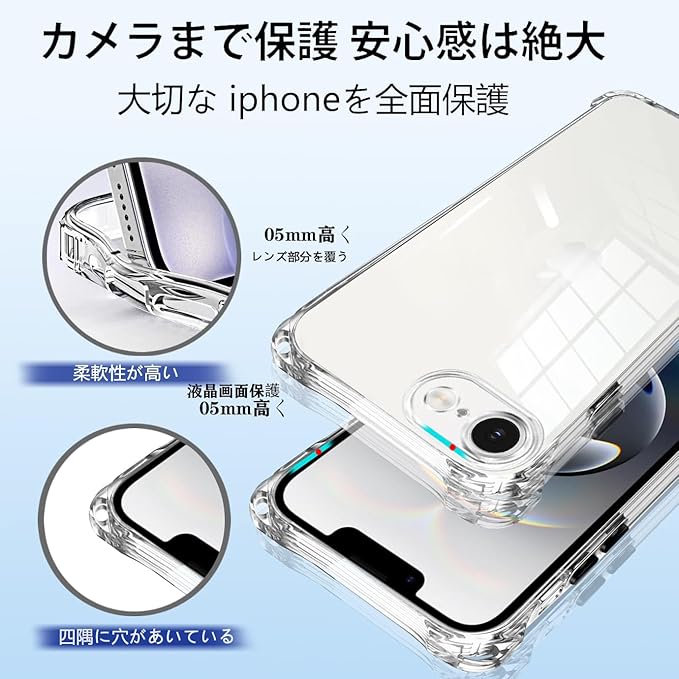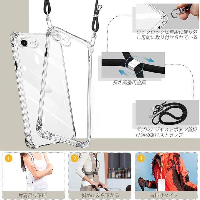 iPhone 16e ケース クリア にはリストストラップとネックストラップが付属します、調節可能なストラップにより、サイド、またはフロントに持ち運べるときに完璧にあなたの隣に掛けることができます。 高透明率の高い特殊なTPU素材を持ち、黄ばみも付きにくい。薄くて丈夫で柔軟性が高く、程よいグリップ感があり、本体の持つスリムさをできる限り損なわないよう設計しています。着脱も簡単で、スマホ本体への擦り傷も心配無用です。衝突や引っかき傷から電話を保護できます。ストラップは、一般的なストラップの1.5倍の厚さで、ストラップを壊さない高品質の強化および厚みのあるナイロン素材で作られています。金具は高品質のステンレス鋼でできており、耐久性が高く錆びません。このアクセサリーはファッションだけでなく、通常のストラップよりも快適で実用的です。 作業、旅行、出張、ショピング、散歩、コンサート、パーティーに最適です。手を離しても、携帯電話を携帯できます。