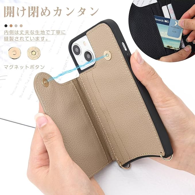 3CCar iPhone 16E ケース 手帳型 (ストラップ付き カード収納 スタンド機能) かわいい おしゃれ 女性向け クリア背面 落下防止 ストラップ着脱可 アイフォン16E 携帯 ケース 財布型 スマホリング付属-カーキ | KAZESHOP