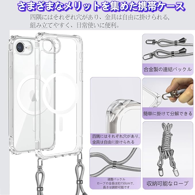 iPhone 16e 用 ケース クリア ショルダー MagSafe対応 アイフォン16e スマホケース iphone 16e カバー 肩掛け 斜めかけ 縄掛けケース 透明 TPU 携帯ケース 紐付き 織りストラップ付き 長さ調整可能 取り外し可能 紛失防止 落下防止 ワイヤレス充電対応(シルバー) | KAZESHOP