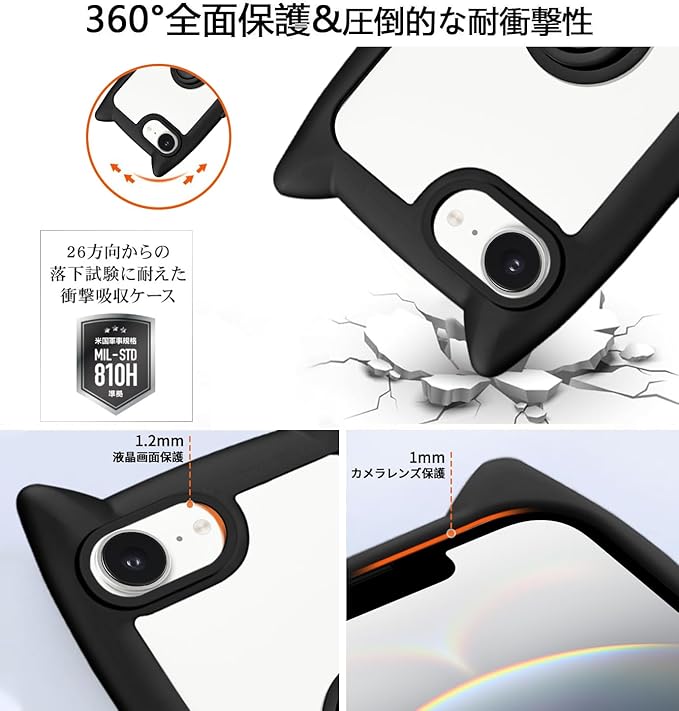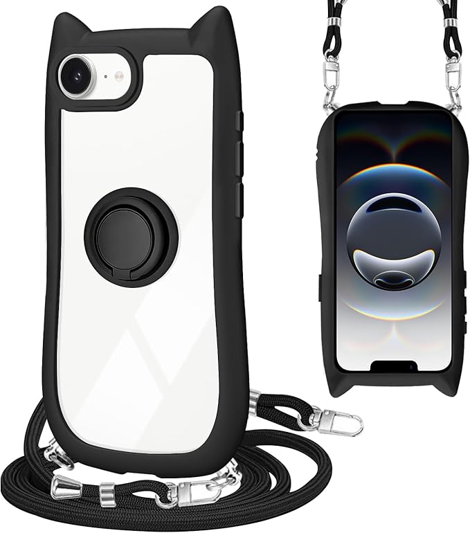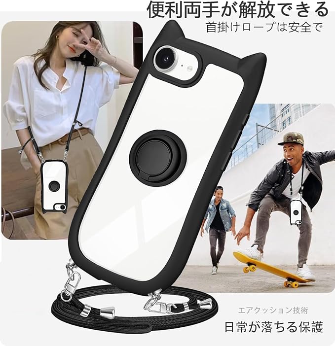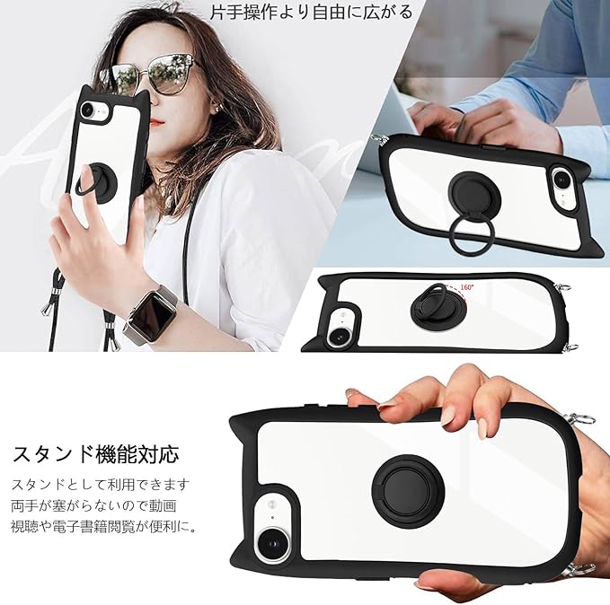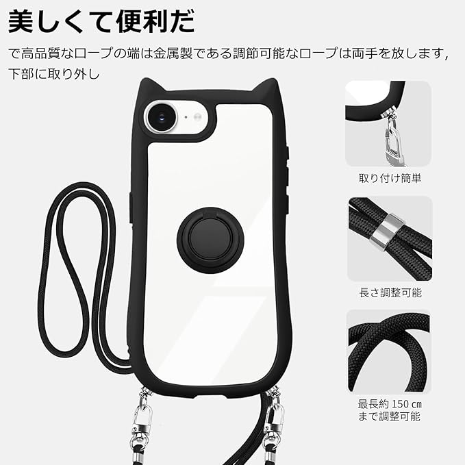 iPhone 16E ケース ショルダー クリア カバー リング付き 隠しスタンド 猫耳 ネコミミ 背面ガラス かわいい おしゃれ スタンド付き ストラップホール アイフォン16e スマホケース 多機能 全面保護 落下防止(ブラック) | KAZESHOP