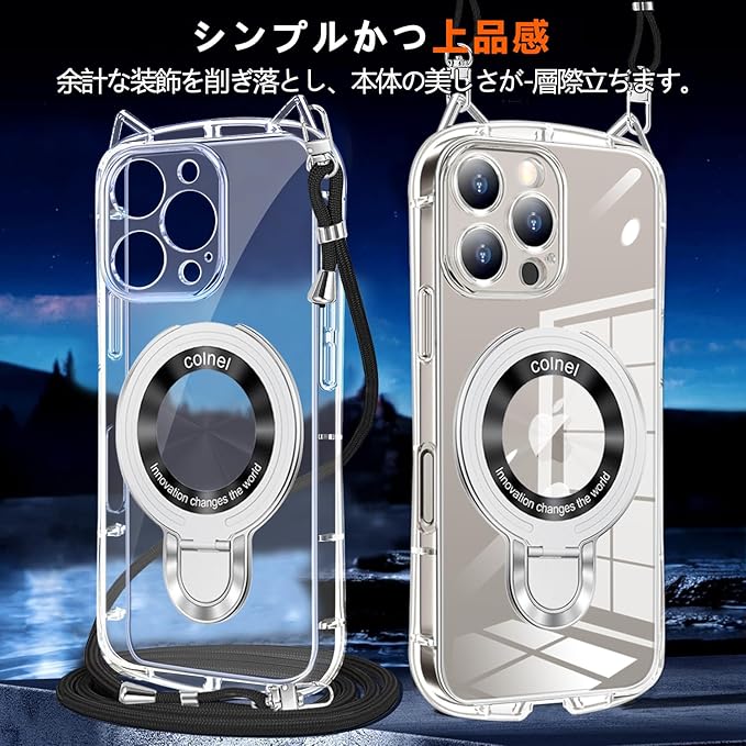 【多目的キャリー & ファッションデザイン】調節可能なストラップにより、サイド、またはフロントに持ち運べるときに完璧にあなたの隣に掛けることができます。 このアクセサリーはファッションだけでなく、通常のストラップよりも快適で実用的です。 作業、旅行、出張、ショピング、散歩、コンサート、パーティーに最適です。手を離しても、携帯電話を携帯できます。 【スタンド機能】多機能スタンドとリング一体型の斬新なデザインです。隠しスタンドの設計で、省スペース性に優れ、収納するときは水平的に置けできて、持ち運びの邪魔になりません。縦置きでも横置きでも安定して支えられ、40 ~120 の間で多角度自由に調整できます。FaceTimeでも動画でも両手が完全に解放されます。また、安定したアルミ合金製の円形スタンドを採用しており、携帯性からもファッション性からも唯一無二の存在です。【簡単着脱・美しさを保つ】猫耳部分にストラップ穴が設けられているのでストラップを簡単に取り付けたり取り外したりでき個人の好みに合わせて装着することができます。猫耳のデザインはストラップを取り外しても可愛らしさが損なわれず一体感のあるデザインで美しさを保ち続けます。【 360 全面保护】、各穴に誤差がなく、すべての機能はケースをつけたままスムーズに操作できます。ケースは、型どりを緻密に実施しておりレーム部分とカメラのフチをちょうどいい設計し。平らな場所においても、画面とカメラレンズに直接触れることがなくまたケースの四隅に落下時の衝撃を効率よく吸収するための技術落下時の衝撃を最小限に抑えます。 【フレキシブル&柔軟】 このTPU+PC ケースは、ネックバンドの電話ケースは高品質のンで作られ、透擦り傷防止 柔らかい手触り滑り止め 黄変防止衝突や引っかき傷から電話を保護できます 調節可能なショルダークロスボディネックレス このアクセサリーはファッションだけでなく、通常のストラップよりも快適で実用的です。