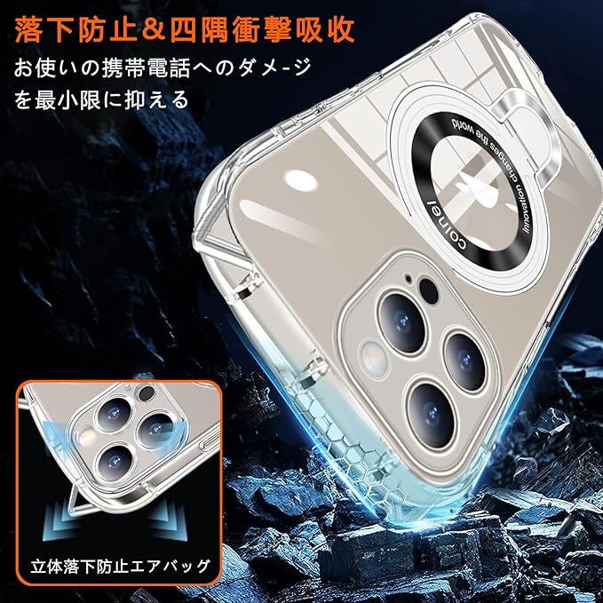 【360 フルプロテクション】精密に型取りされたデザインで穴開け位置が正確なため、ケースを装着したままでも全機能がスムーズに操作できます。フレーム部分とカメラ周辺にはわずかながら浮かせた設計を施し、平らな場所に置いた際に画面やレンズが直接接触するのを防ぎます。さらに、四隅に衝撃吸収技術を採用しており、落下時の衝撃を最小限に抑えることができます。