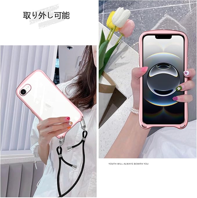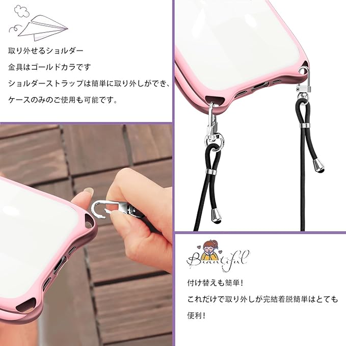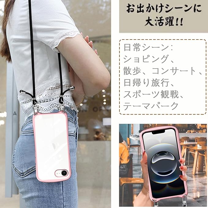 iPhone 16e ケース ショルダー クリア アイフォン16e カバー スマホケース 耐衝撃 透明 TPU ストラップ付き 肩掛け 首掛け 紐付き 斜めがけ シリコン 取り外し可能 長さ調整可能(ローズゴールド) | KAZESHOP