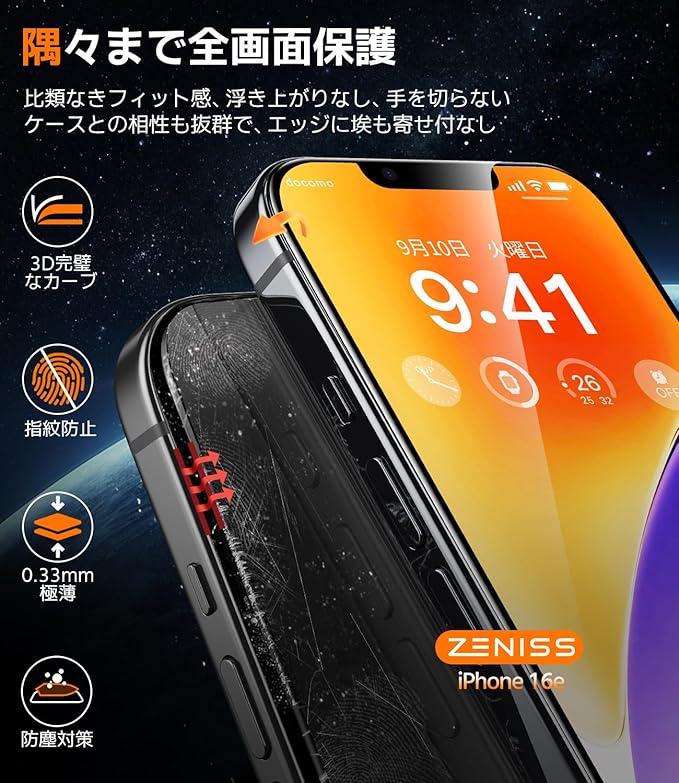 【指紋防止&画面の手触りを再現】スマホ フィルムの厚さ0.33ミリの超薄型デザインで、携帯フィルム表面は驚くほど滑らかです。独自のZ-Silk電気メッキコーティング技術100000+防水撥油層の形成のおかげで、汗、油汚れ、指紋を効果的に防ぎます。画面をスワイプする指がより滑らかになり、携帯電話の操作感が新たなレベルに向上。ゲームをよくプレイする人には見逃せない!*指紋、水滴、汗、油、化粧などが付着しても簡単に拭き取ることができ、スマホの画面を新品のようにきれいに保つことができます。 これまでに10万人以上のお客様から賞賛の声をいただいています。注:箱はまだ16eモデルに更新されておらず、14/13/13proと書かれています。16eモデルに対応しています。