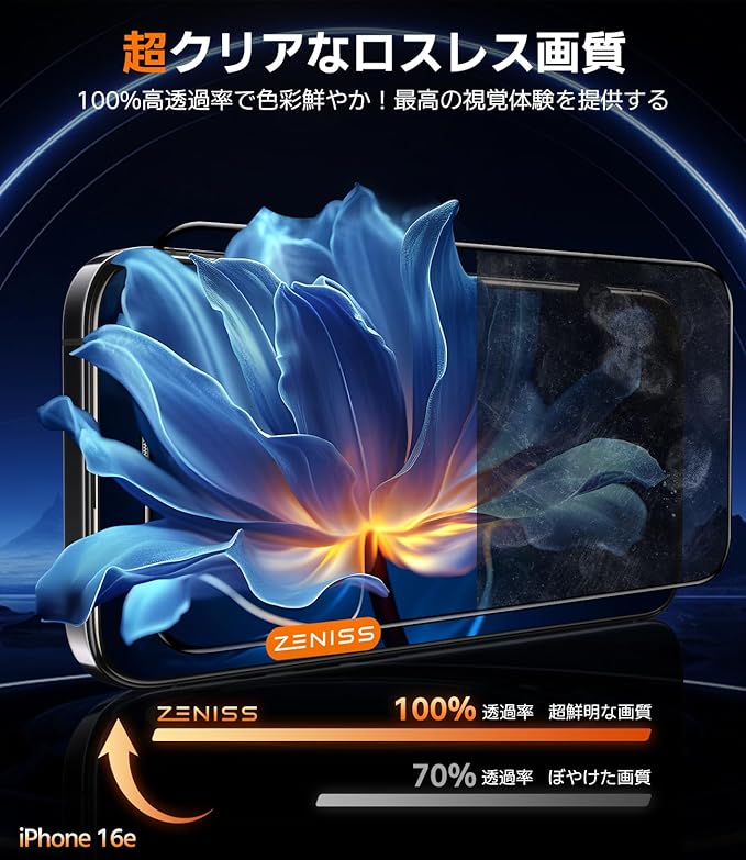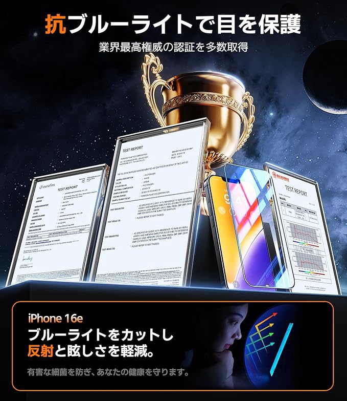 【超クリアなロスレス画質&健康を全面的に守る】このいphone 16 e 保護フィルムは、新しくアップグレードされた高透過率素材を採用し、高透光率、スマホ画面のオリジナルの高精細な画質を再現、超クリアな視覚体験を提供します。また、弊社のいphone 16eガラスフィルムは、国際認証のブルーライト防止テストと抗菌テストをクリアしています。ガラスフィルム表面のAnti-Reflective/Anti-Blue Lightコーティングにより、ブルーライトをカットし、長時間や夜間にスマホを使用する際、ブルーライトが視網膜に与える潜在的なダメージを防ぎます。 目を大切に!さらに、最新のナノ抗菌技術を採用し、表面に付着する99.9%の細菌を強力に抑制します。お子様も安心して触れることができ、あなたとご家族の健康を全面的に守ります!