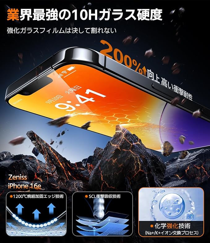 【硬度レベル!10H 強化ガラス フィルムで究極の保護を】弊社のiphone用の 16e フィルムは、米軍規格の航空宇宙グレードの高アルミシリコンガラス素材を使用し、最新のNa+/K+イオン交換技術により、ガラス内部に圧縮緩衝層を形成しています。1200℃で10時間の高温硬化を繰り返し強化、10H硬度レベルを実現。硬度と耐衝撃性が市販の普通製品より20倍も高いです。200%の保護力で衝撃や傷からiPhoneを最大限に守ります。鍵やコインなどの鋭利な物と一緒にバッグに入れても傷がつきません。さらに、ガラスは破片飛散防止加工が施されており、使用者の安全を確保する。 安心してお使いいただけます。絶対的な安心感を与えます。