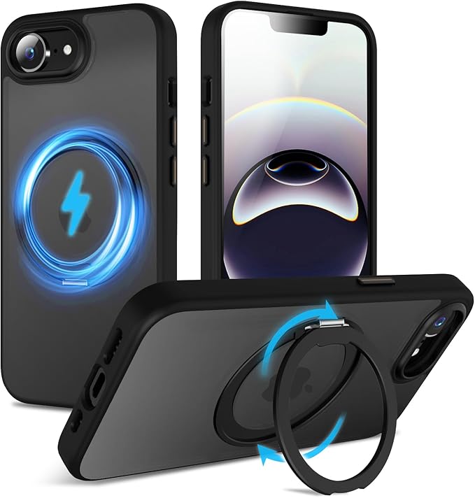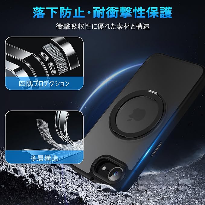 QUEASON【iPhone 16e 用 MagSafe対応 ケース】360 回転スタンド ワイヤレス充電対応 あいふおん16e ケース リング付き 米軍MIL規格 アイフォン16e ケース magsafe 超強磁力 落下防止 耐衝撃 半透明 防指紋(ブラック) | KAZESHOP