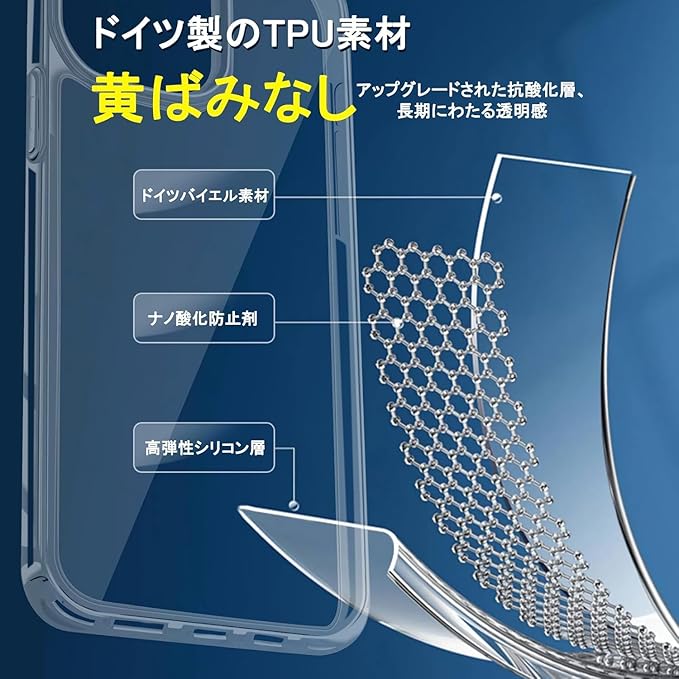 【高品質な素材で長持ちの透明さ】:ドイツ・バイエル社から輸入した高品質で環境に優しいTPU素材を採用しており、時間の経過による黄ばみやぼやけを心配する必要はありません。高い透明度を持ち、iphone本来の美しさやカラーを楽しめます。