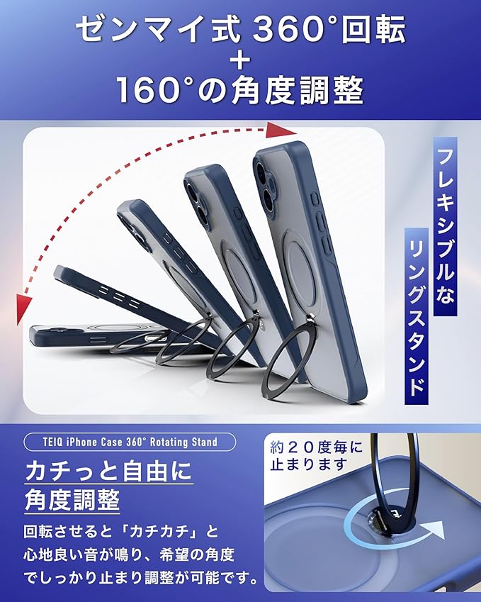 ✅【 カチッと自由に 角度を調整 】 iPhone 対応スタンドケースはスタンドを回転させると「カチカチ」と心地良い音が鳴り、希望の角度でしっかり止まり調整が可能です。類似の回転式のリングスタンドにありがちな「角度が決まらない問題」を解決します。