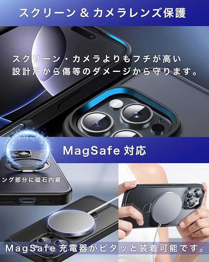 ✅【 MagSafe対応・強力な磁力保持力 】 iPhone 用 ケースのリング部分には、マグネットが内蔵されており、MagSafe充電器やその他のMagSafeマグネットアクセサリーをしっかりと固定します。MagSafeアクセサリーと互換性があり、安心してご利用いただけます。※本製品はMagSafeデバイス専用で、QIワイヤレス充電には対応しておりません。予めご了承ください。