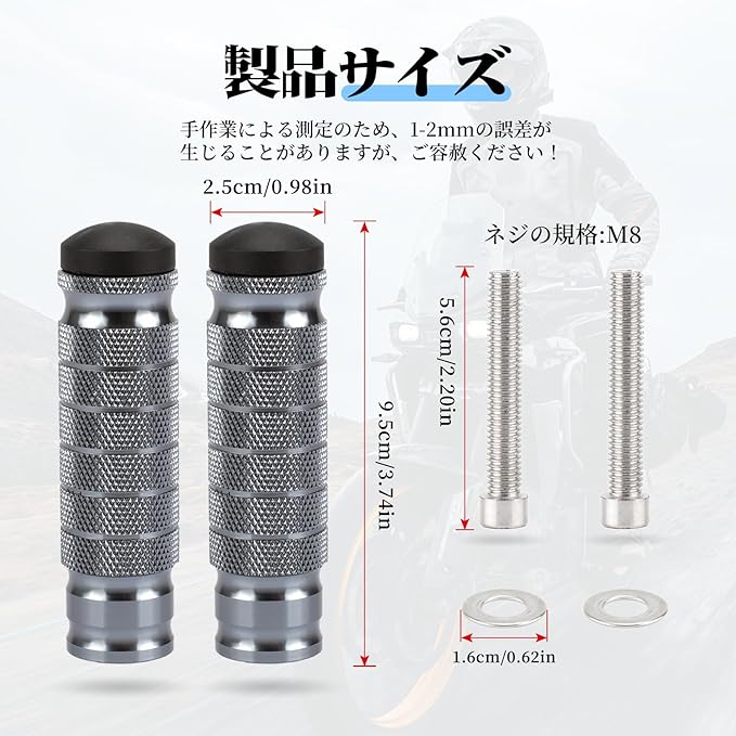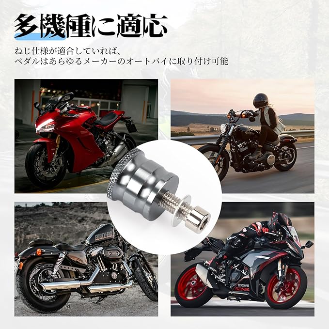 【幅広い互換性】シンプルなデザインでどんなバイクにも合わせやすいバイク用フットペグ。ネジ規格さえ合えば、さまざまなメーカーのオートバイに取り付けて使用することができます。このステップバーのネジ規格はM8です。ホンダ、ヤマハ、スズキ、カワサキ、ハーレーなど幅広い車種に簡単装着が可能。