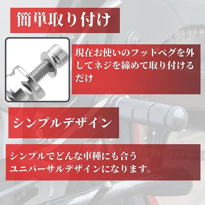 ストレート型オートバイ用フットペグ (M8規格ボルト付き) 左右セット 製品概要 : ストレート型のオートバイ用フットペグ、左右1ペアセットです。取り付けに必要なM8規格のボルトとワッシャーが付属しており、簡単に装着できます。