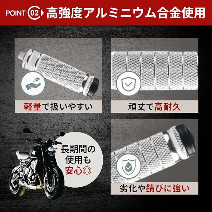 【危険回避!「雨でも滑らない」絶対的な安心感】 特に雨の日や悪路での走行中、フットペグが滑ると命に関わる危険も。このフットペグは、緻密に計算された「超滑り止め加工」を施しています。ウェットな路面でも、激しい振動の中でも、足元をがっちりホールドし、あなたのライディングを安定させます。長距離ツーリングでの疲労軽減にも貢献し、常に最高のパフォーマンスを発揮できます。 【目を奪われる「洗練されたデザイン」で愛車を魅せる】 機能性だけでなく、デザインにも徹底的にこだわりました。CNC加工によって削り出された高強度アルミニウムは、見る者を惹きつけるシャープでスタイリッシュな輝きを放ちます。どんなバイクにも自然に溶け込みながら、ワンランク上の存在感を演出。カフェレーサー、ストリート、アメリカン、ネイキッド…あなたの愛車を、さらに個性的にドレスアップします。