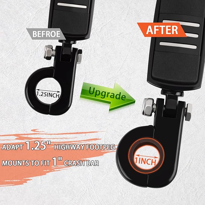 互換性:1.25インチ(32mm)ハイウェイフットペグマウントを1インチのクラッシュバー/エンジンガードにフィットさせるスペーサー、ユニバーサルバイクアプリケーション用に設計されており、ハーレースポーツスター、ダイナ、ホンダ、ヤマハ、カワサキ、スズキ、トライアンフ、BMWモデルと互換性があります。