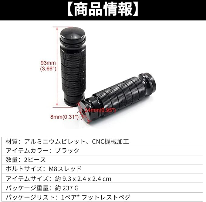 【商品機能】アイテムの種類:オートバイリアフットレスト 材質:アルミビレット 数量:2個 ボルトサイズM8 商品のサイズ: 9.3 x 2.4 x 2.4 cm パッケージの重さ:約237g パッケージ内容: 1 * M8オートバイフットレスト
