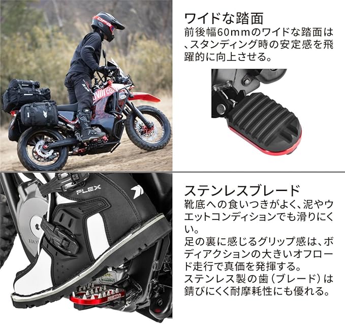 ワイドなゴムカバーは車体からの振動を吸収し、ロングツーリングでライダーへの疲労を大幅に軽減。また、適度なグリップによりスムーズなステップワークを可能とし、靴底への攻撃性も低い。