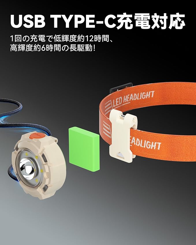 【Type-C充電式&長時間点灯】ヘッドライトはUSB Type-C充電対応、1回の充電で低輝度約12時間、高輝度約6時間の長駆動! 電池交換不要の省エネ設計により、キャンプや災害時の電源切れ不安を完全解消。