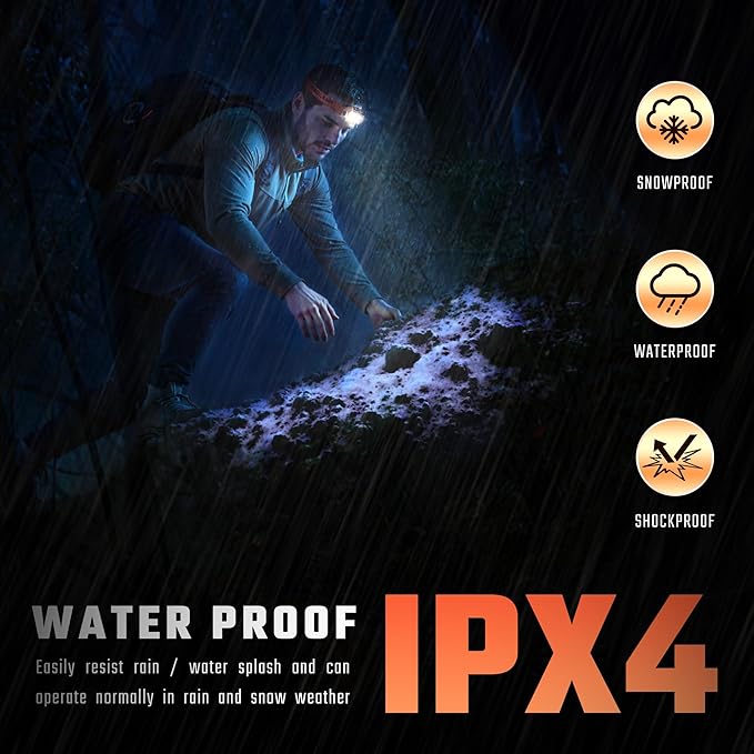 [アップ/ダウン60度調整可能なヘッドランプ]:60角度調整は簡単に照明角度を制御することができ、それを必要とする場所で自由に照明することができます。IPX4耐水グレードと評価されています。高品質で漏れにくい防水スイッチと配線により、雨が浸っていてもライトが点灯したままになります。もはやかさばることはなく、このヘッドランプの重さは57gしかなく、着用者を重くしすぎず、長期的な使用ニーズを満たしています。