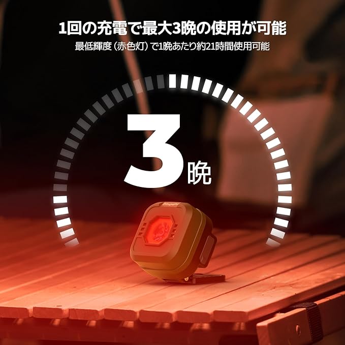 【驚異の長時間連続使用】 最長21時間の連続使用が可能。赤色光モードでは1晩あたり約7時間使用でき、最大3晩連続で使用可能。長時間のキャンプや停電時にも安心して活用できます。