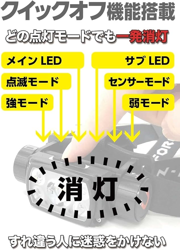 【クイックオフ】何度ボタンを押さなくてもボタン1つで一発消灯。どの点灯モードからでも消灯が可能なのですれ違う人にも迷惑をかけません。