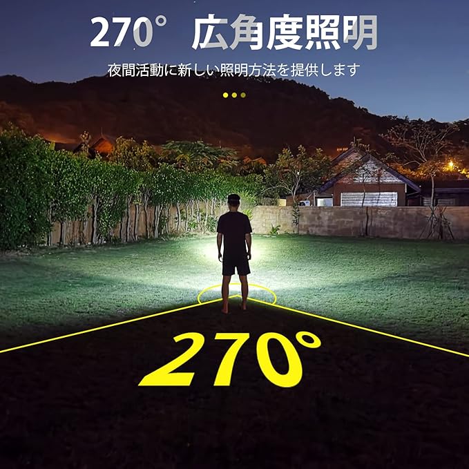 【高輝度270 広角度照明】本体は2種の高輝度光源があり、集光・散光は同時点灯可能で、最大照明角度は270 で、他社製品よりも照射角度がひろいです。明るさは550ルーメン、照射距離最大約100メートルを備えております。驚くべき超広角ヘッドライトは、夜間活動に新しい照明方法を提供します。登山、ランニング、釣り、自動車整備、洞窟探検、などでのアウトドア活動に大活躍します。