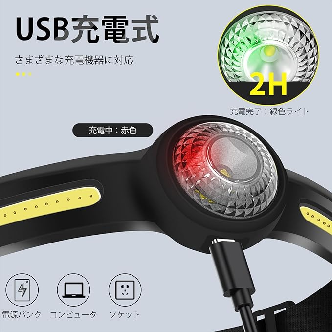 【Type-C充電式】:ヘッドライトには600mAのリチウム電池が内蔵されており、充電するだけで使用できます。Type-C充電式の原因で、通常の充電器よりも充電時間が速くなるからです。フル充電に要する時間は2時間、点灯時間は最大7時間です。 緑色のライトはフル充電、赤色のライトは充電不足を示します。 赤色点滅の場合は、充電不足で充電が必要なことあります。経済的で省エネ、電池の交換ことを心配必要ありません。