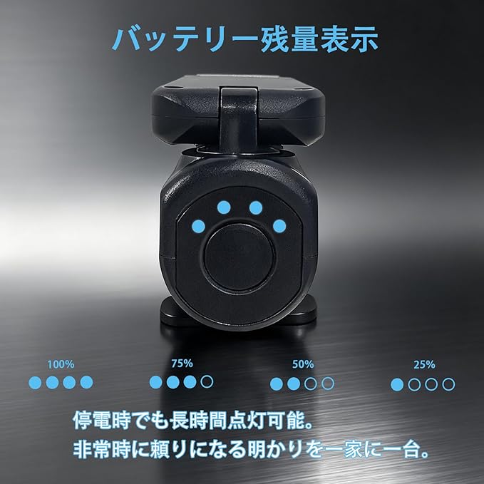 【6段階調光・角度調節】明るさは6段階からお選びいただけます。省エネモードで長時間の使用も可能。さらに、本体を180度以上回転させられるため、天井に向けて非常灯としても、任意の角度に固定して作業灯としても活用できます。
