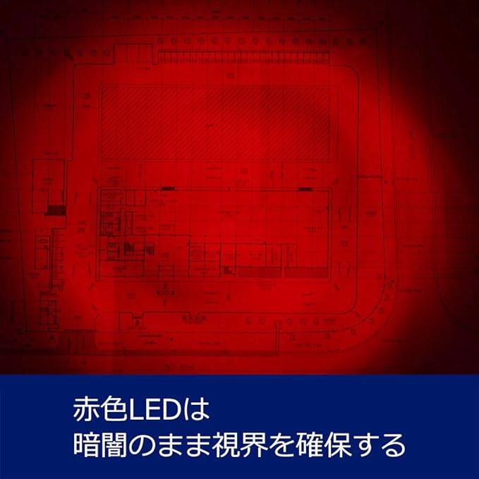 ●暗闇のまま視界を確保する赤色LED搭載 ●耐塵・防滴(IP64準拠)&1m落下耐久 ●リフレクタータイプで広範囲照射が可能