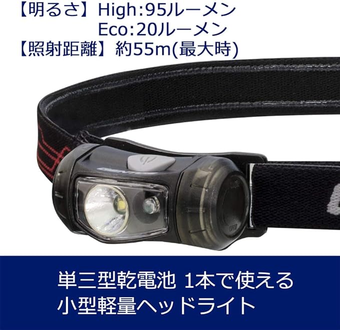 明るさ:High/95ルーメン、Eco/20ルーメン、赤色LED/1ルーメン