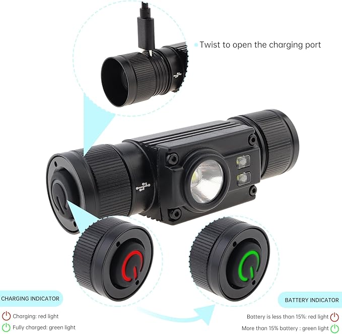 【USB TYPE-C充電】内蔵のUSB TYPE-C充電ポートは、逆差し防止機能、防水・防塵設計で、充電ポートを長持ちさせます。18650バッテリーに対応しており、バッテリーは含まれておりません。充電中は赤いランプが点灯し、充電が完了すると緑のランプが点灯します。充電時間:3時間。