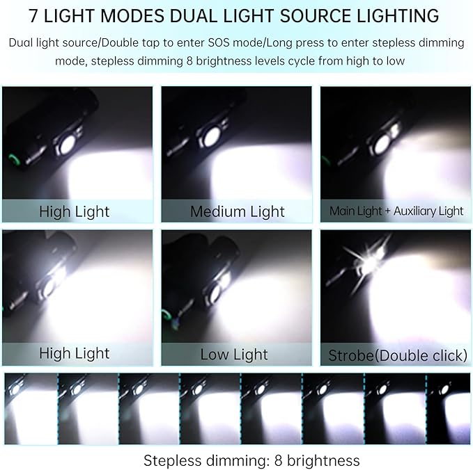 【7つの調光モードで使い方自由】7段階の調光モードにより、明るさを状況に合わせて調整可能。暗い夜道から作業時の細かな作業まで、幅広いシーンで活躍します。スイッチ操作が簡単で、長押しするだけで7段階の明るさに切り替えできます。メモリ機能:任意のモードで5秒以上待機後、再度ライトを点灯すると、前回のモードに戻ります。