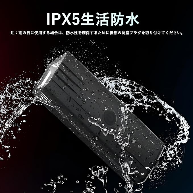 IPX5等級の防水性能:悪天候下でも問題なく使用できる防水性能を持ち、さまざまなアウトドア活動に適しています。注:雨の日に使用する場合は、防水性を確保するために後部の防麈プラグを取り付けてください。
