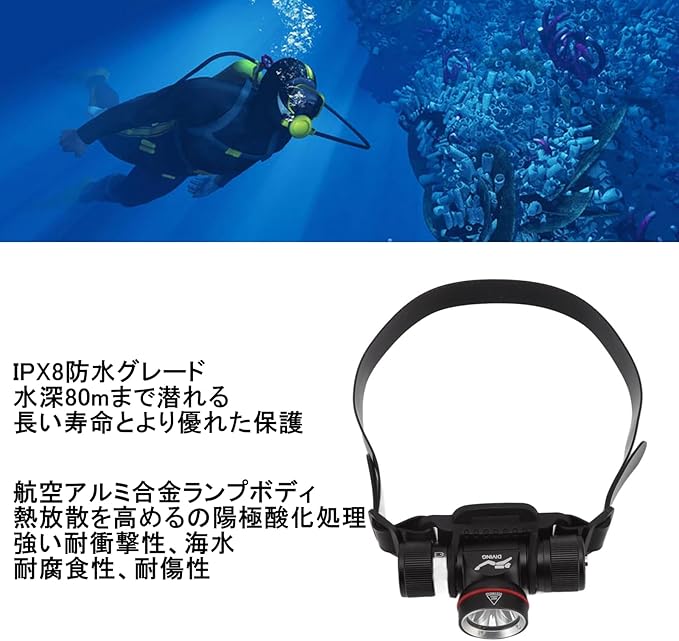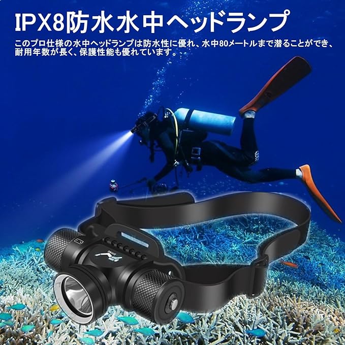 【多様な用途に最適】このLEDヘッドランプは、ダイビングや水泳、水中探検、豪雨や雪など多様な環境で使用するのに非常に適しています。どんな状況でも明るく照らし出し、視界を確保するのに役立ちます。アウトドア愛好者やプロフェッショナルにもぴったりのアイテムです。