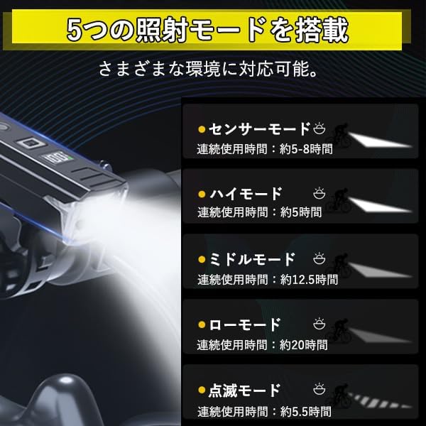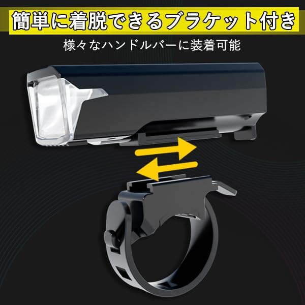 【商品説明】 ・強力な明るさで最大100m先まで照射可能。5つの照射モードを搭載し、さまざまな環境に対応。 ・防水設計で雨天でも使用可能。簡単に着脱できる便利なブラケット付き。 ・Type-C充電。最大20時間稼働。LED電池残量表示でバッテリー管理も簡単。 ・光センサー搭載。周囲の明るさに応じて自動調整し、夜間の安全性を確保し省エネ。 【商品仕様】 カラー:ブラック 重量 90g