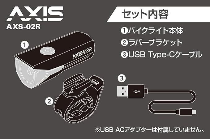 セット内容・付属品:本体・ラバーブラケット (対応ハンドル径 : 19~33mm)・USB Type-Cケーブル (20cm)・専用充電池 (内蔵)、使用電池:専用充電池