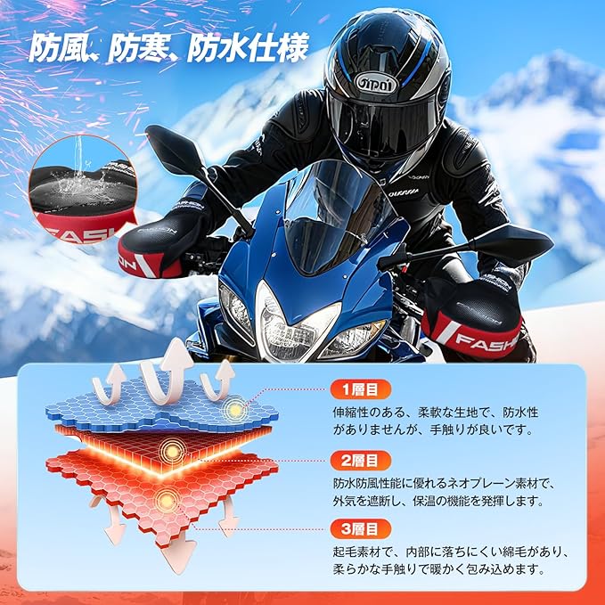 【3層構造】アップグレードされたバイクハンドルカバーは、3層防護構造を設計しております。外側は防風層、中間はネオプレンの防水層、内側は起毛裏地の保温層。三層構造で保温性に優れ、厳しい寒さの中でも両手を温かく保ちます。