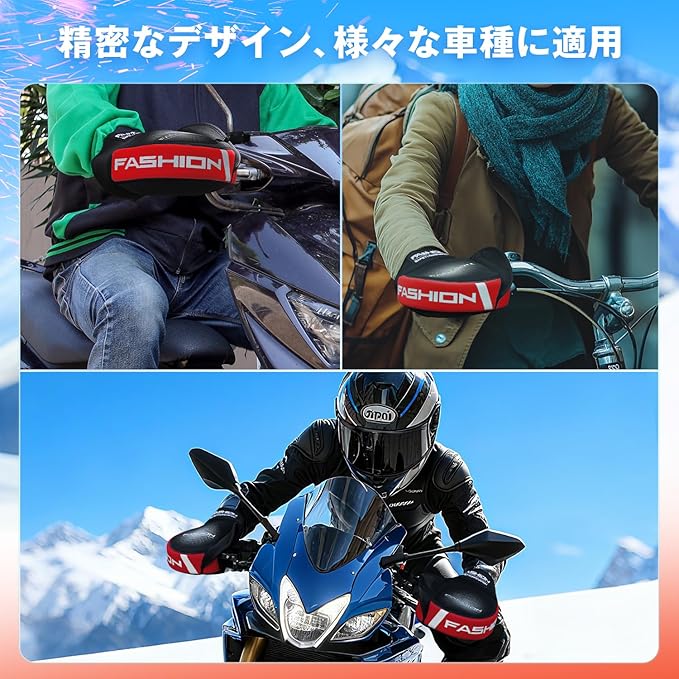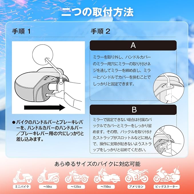 【取付簡単】汎用のバイクハンドルカバーは、固定式バックルをアップグレードし、取付がより簡単になりました。同時にミラー固定用ホールにより取付可能です。大・中・小型のほとんどのバイク、スクーター、モペットなどの車種に対応します。