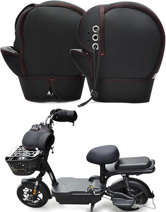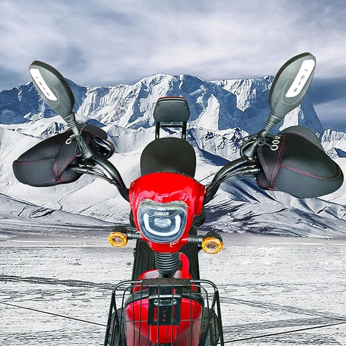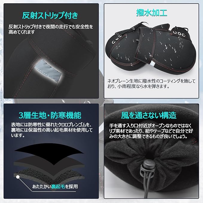 【ゴム紐でサイズ調整は可能】:独立したハンドルとブレーキホールだけでなく、ハンドルカバーは中が広く、手袋をした状態でも手を出し入れしやすいデザインになっているため、運転操作の邪魔をしません。ハンドルカバーの袖口は伸縮性があり、手袋をはめたままでも簡単に出入りできます。