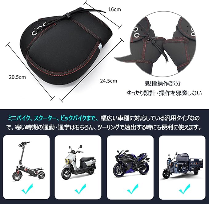 【冬の必需品】:風が入りにくいミトンタイプで、あたたかい裏起毛を採用します。撥水、防寒、防風仕様の温かいバイク用ハンドルカバーです。ミニバイク、スクーター、ビックバイクまで、幅広い車種に対応している汎用タイプなので、寒い時期の通勤・通学はもちろん、ツーリングで遠出する時にも便利に使えます。