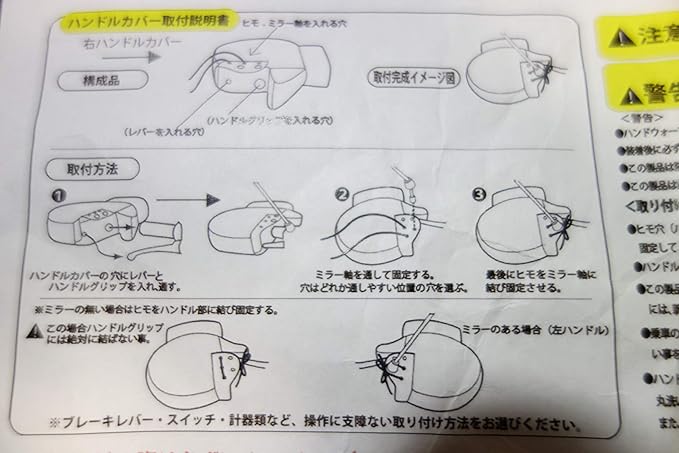 FS-JAPAN ヒーター付きハンドルカバー 保温、防風、撥水 機能満載のウインターアイテム。 汎用の高い設計!幅広い車種への装着が可能! グリップ交換不要!取り付け簡単! コントロールスイッチがハンドルカバー本体にありますのでスイッチの装着に困らない 寒い日にありがたい急速加熱モード装備 【操作方法】 両側のハンドルカバーにあるスイッチを押すと、電源がONになり、ハンドルカバー内に加温します。 電源ON: 赤ランプが点滅するまで、3秒ほどスイッチを押すこと。 電源OFF: パイロットランプが消えるまで、スイッチを押し続けること (約3秒間)。 階調整可能のLEDシリコン温度コントローラー搭載。 a. 赤ランプ点滅- 急速加熱 (電源ON,OFFにするたび、この段階になります。5分間後自動的に中温段階になります) b. 赤ランプ - 高温 c. 白ランプ - 中温 d. 青ランプ - 低音 いつでも温度調整可能:電源押すたび、温度設定を循環します。 使用後に、ランプが消えるまで、左右のスイッチを押して下さい。 ※自動遮電機能が搭載しないため、スイッチの消し忘れにご注意下さい※ 【本体素材】 表:合皮ポリウレタン 裏:特殊導電発熱繊維 間にスポンジを挿入。 【取付方法】 1. ケーブルAの端子をバイクのバッテリにつなぐこと。赤の端子をプラス側に、 黒の端子をマイナス側に接続して下さい。(写真の図をご参考に) 2. ケーブルAのもう片側をケーブルBに接続して下さい。引っかからないため、 余ったケーブルをバンドかテープで車体に固定して下さい。 3. ケーブルBのもう片側の端子を左右のハンドルカバーの本体に接続して下さい。 【ケーブル規格】20awg(30Ω 11.1V 4W) ※注意事項※ レギュレーターを改造した場合、バッテリー異常になりやすく、ハンドルカバーのヒューズが 切れるおそれがあります。 12V専用 6Vやバッテリーレス車両には取り付け不可 バッテリー容量が少ない場合は性能を発揮できない場合がございます。 シグナスX等、ミラー位置の関係でミラー軸がカバーの穴に取り付けできない場合がございます。