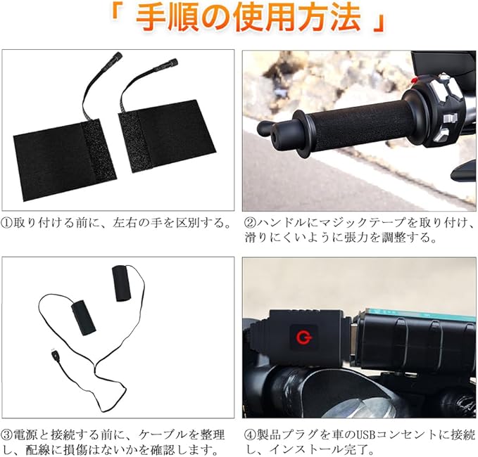 【IP67完全に防水】上品質なケブラーで作られたバイクusbグリップヒーターは耐久性強い、8000回の摩耗テストに合格し、またIP67完全に防水質材を採用し、他のフリース仕様より水が溜まりにくい、水が溜による温度不足になることありません。雨や雪にも対応できます。注:グリップヒーターをできるだけ乾燥させてください。濡れた状態では、水が熱を奪い、温度感を下げてしまいます。悪天候の場合はUSBポートが濡れて故障しないようにしてください。