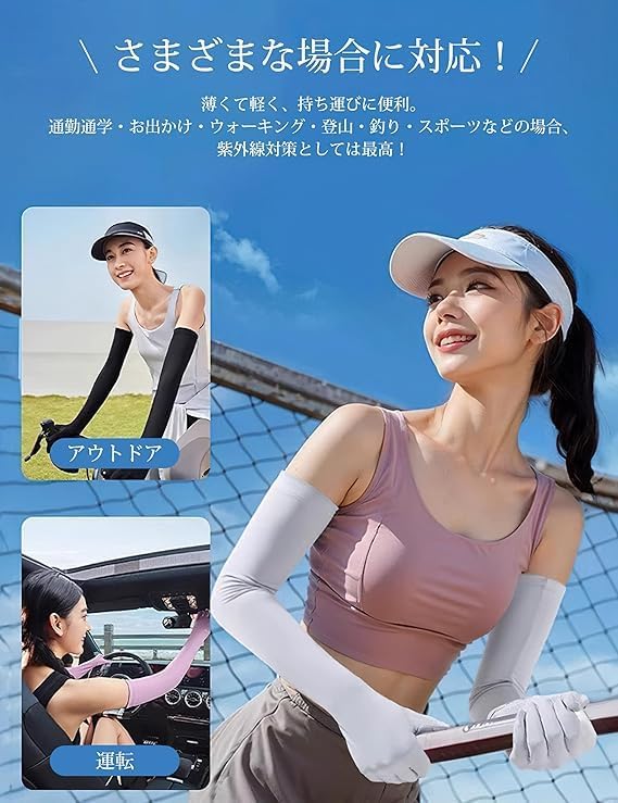 【多用途でシーンを選ばず大活躍!】指先の滑り止めシリコン加工でグリップ力が向上!通勤・ドライブ・自転車・サイクリングはもちろん、アウトドアシーンでも大活躍する万能アームカバーです。超薄型でコンパクトに折りたためるので、バッグにサッと収納可能。シンプルかつおしゃれなデザインで、普段使いからアウトドアスタイルまで幅広くマッチ。強力UVカット効果で、春夏はもちろん、紫外線が気になる季節の必須アイテムとしてご活用いただけます!