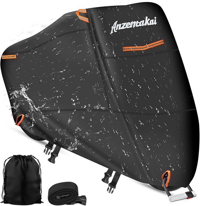 バイクカバー 500D 厚手【2025年 耐久性アップ】 耐水圧20000mm 車体カバー 湿気対策 耐熱 防水 風飛び防止 チェーンホール付き 2.5m防風ベルト付き 収納バッグ付き 警告反射テープあり 超撥水 紫外線防止 バイク用レインカバー スクーター/原付/125cc/250cc用/400cc用 | KAZESHOP