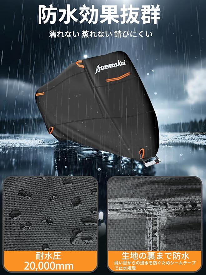 【高防水・高撥水機能】生地は3層構造で丈夫さに加え、2本針で縫製し、より強度のある作りに、長時間の使用にも脱線やひび割れし難くなります。裏面は縫い目、針穴からの水の浸水を防ぐシームテープで防水処理しております。それより、雨水がカバー内に溜まらず自然に流れ落ちる設計で、急な雨や長時間の降雨でもバイクをしっかり守り、金属部分の錆びを防ぎます