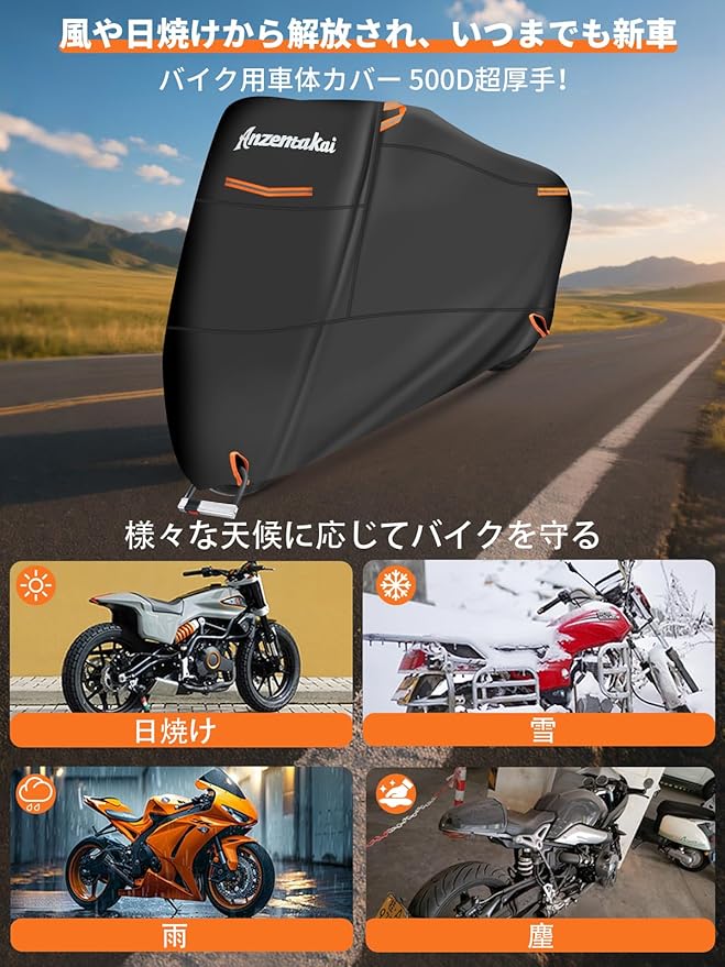 【高耐久性の素材】高品質な500D厚手オックス素材を使用、通常この素材はテントに使用され、高い防水および耐摩耗性を持っています、この素材はバイクカバーに応用され、丈夫さと柔らかさを同時に兼ね備えた特性を完璧に実現します。生地自体にある程度の重量があり、突風に煽られにくく、丈夫で安定します。長期間使用しても色あせや劣化が少なく、優れた耐候性と耐光性を持ちます。バイクを屋外保管されている方にはお勧めです