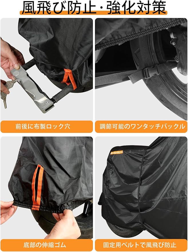 【4重防風対策と通気口の設計】風飛び防止ベルトをカバー下部中心に設置しております、ロック穴、裾を絞るゴム、ワンタッチバックルと付属2.5m防風ベルトの4重効果で、バイクを強風から守ります。前方左右ミラー位置に通気口があり、雨天走行後の蒸れやすい状況でも通気性を確保し、錆・腐食の防止効果、雨上がりや梅雨時期でもバイクを乾燥した状態に保ちます