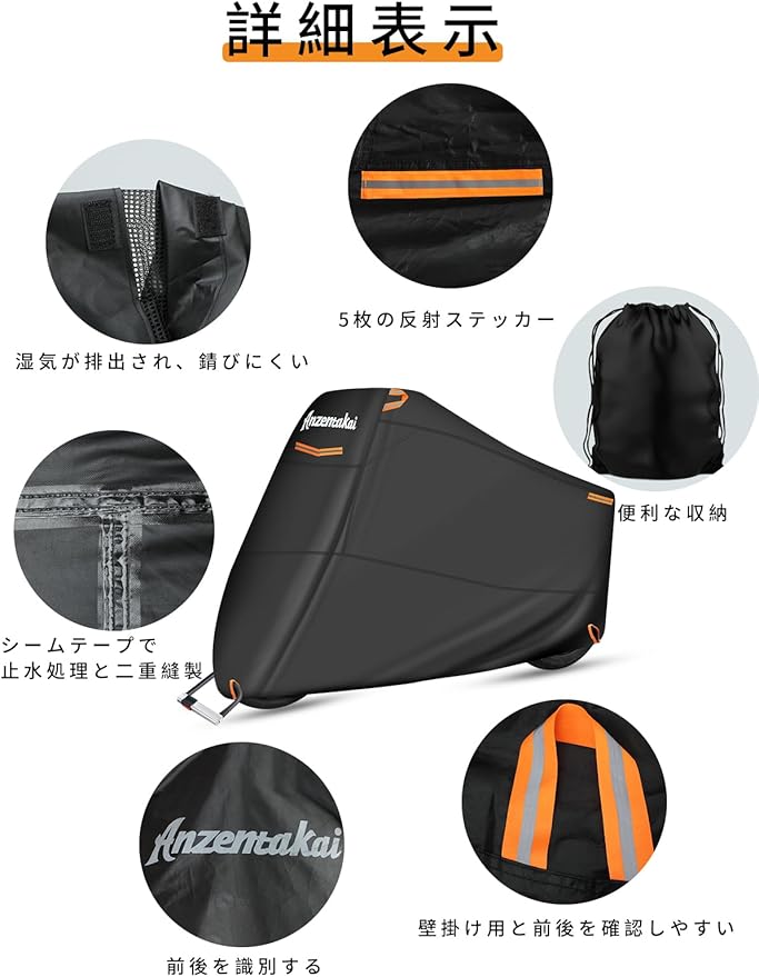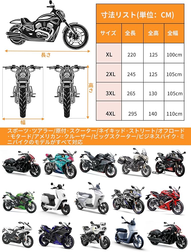 【収納便利・簡単着脱】フロントにはAnzentakaiのロゴとハンドルが付いており、カバーの前後を容易に見分けることができる。収納バッグが付属し、持ち運びが簡単、出先でもバイクをしっかり保護します。サイズは4種類あり、スクーターから大型バイクまで対応します。4XL:295*140*110cm